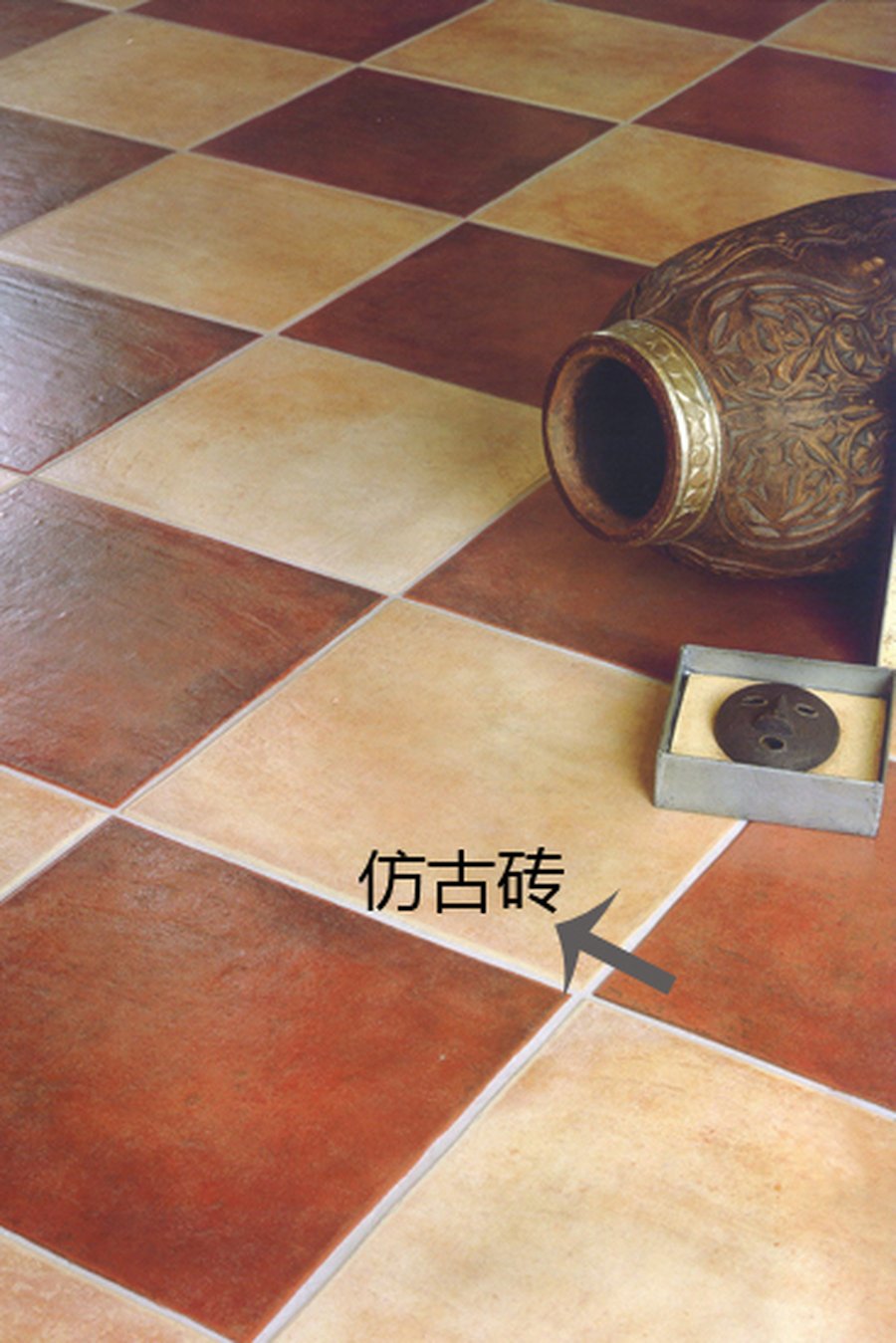 仿古瓷砖又叫复古砖,实质上是上釉的瓷质砖做成仿古效果,纹理多半呈现出石板、岩片的自然感(板岩砖就属此类),表面分为雾面和平滑两种。仿古砖湿气重时会将水汽吸入,干燥时再释放而不会在表面凝结水汽,不容易滑倒,安全性较高,且冬天时不像石材地板冰冷,触感较佳。