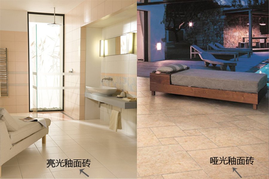 亮光釉面砖是釉面砖的一种,亮光是相对哑光釉面砖而言,哑光是光线向四周各个方面发射、光线柔和,用在昏暗的空间不太适合;而亮光釉面砖表面的反光效果好,突出显示清洁度和明亮感。