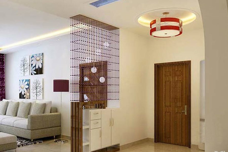 细窄走道型的玄关设置有时候容易从进门的第一印象其就让人觉得空间狭小,其实这种空间感完全可以利用镜面和光源的“魔法”来解决,玻璃、镜面、珠帘等通透性质的材料一方面能够解决室内的采光问题,同时也避免了玄关墙面的单调,增加了室内的艺术性和美感。