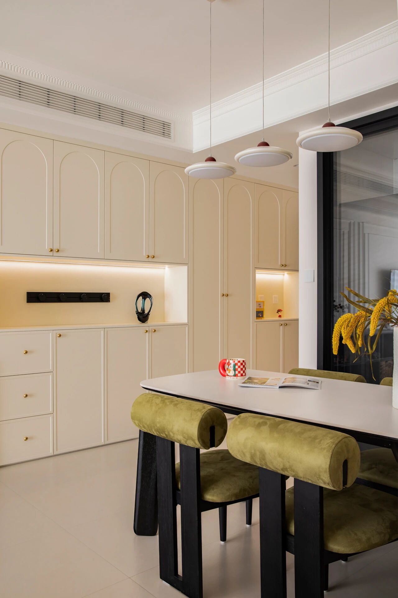 作为连接客厅和厨房的“通道”,一些杂物放在餐边柜收纳不显乱又方便拿取。