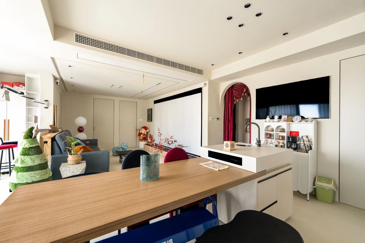 在下面这个案例中,利用墙体的拐角做延伸式转角柜,边角处做弧面柔化处理,空间利用率更高,整体的视觉效果看上去也更流畅。